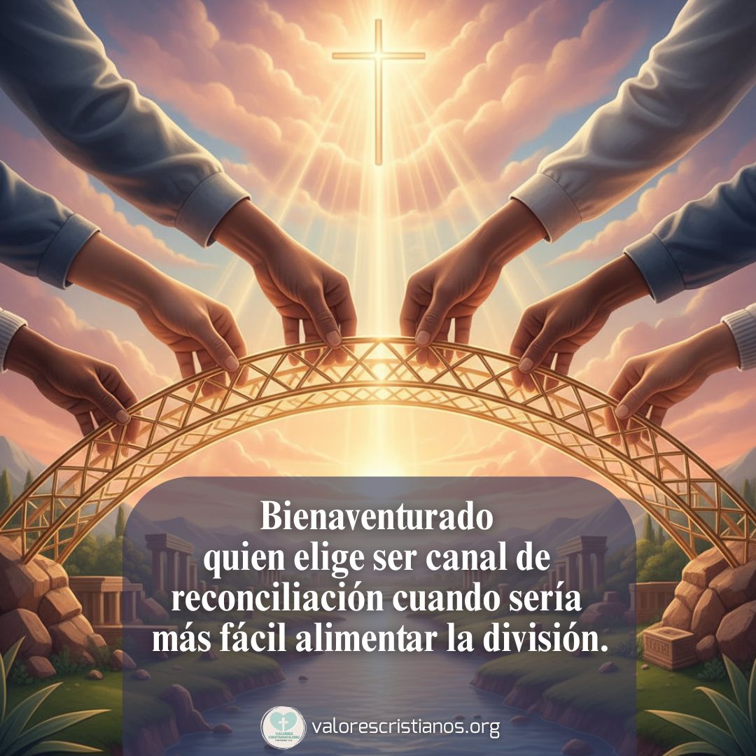 Padre celestial, te agradecemos por llamarnos a ser pacificadores en un mundo dividido. Reconocemos que la verdadera paz solo viene de ti y que necesitamos tu gracia para ser agentes de reconciliación. Danos sabiduría para abordar los conflictos con amor y verdad, valor para tender puentes donde hay divisiones y humildad para buscar la paz incluso cuando cuesta. Ayúdanos a reflejar tu carácter reconciliador en cada relación y circunstancia. Que nuestras vidas manifiesten que somos auténticos hijos tuyos mientras trabajamos por la paz que supera todo entendimiento. En el nombre de Jesús, el Príncipe de Paz, amén.
