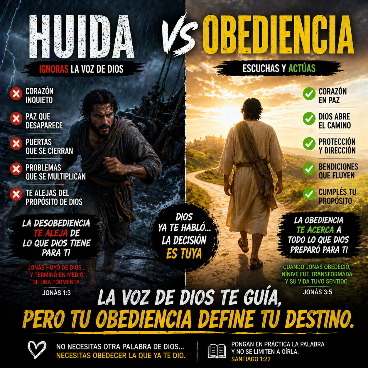 El devocional de hoy nos enseña que la fe sin obediencia es solo conocimiento vacío. Dios no busca personas perfectas, busca personas dispuestas. Jonás aprendió que no hay lugar donde esconderse del propósito de Dios, y que la desobediencia solo retrasa lo inevitable. La lección más profunda es esta: la voz de Dios siempre guía, pero tu obediencia define tu destino. Hoy tienes una oportunidad de alinear tu voluntad con la de Dios. La obediencia no es un sacrificio, es la puerta más grande que jamás podrás abrir. Da el paso. Dios ya habló.